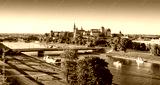 Poland. Krakow aerial panorama with historic royal Wawel castle and cathedral, Vistula river with a bridge, boats, on board restaurant. Promenades and parks along the riversides. Sunset light