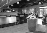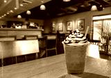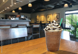 Frappuccino with cream and chocolate sauce in takeaway cup on wooden table at cafe