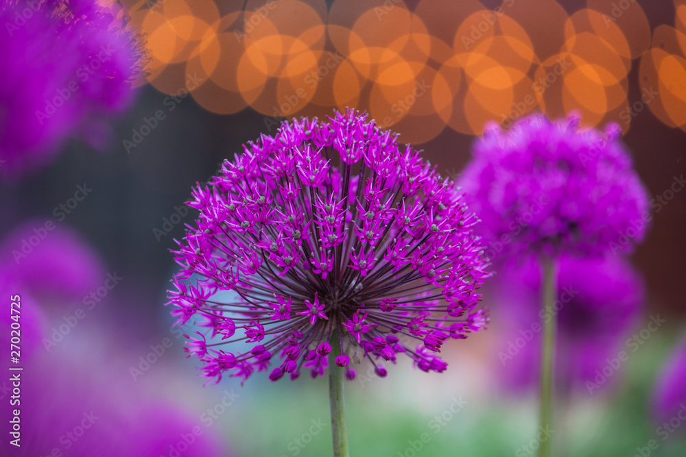 purple flowers on a blurred background, flowers of onions, a large ball, blurred lights on the background