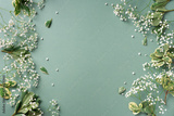 Small white gypsophila flowers on pastel green background. Women's Day, Mother's Day, Valentine's Day, Wedding concept. Flat lay. Top view. Copy space