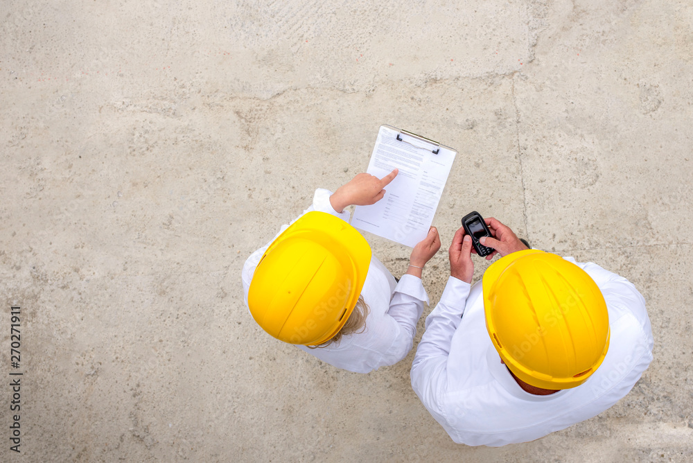 Top view of two civil engineers on site exchanging ideas and discussing about project status