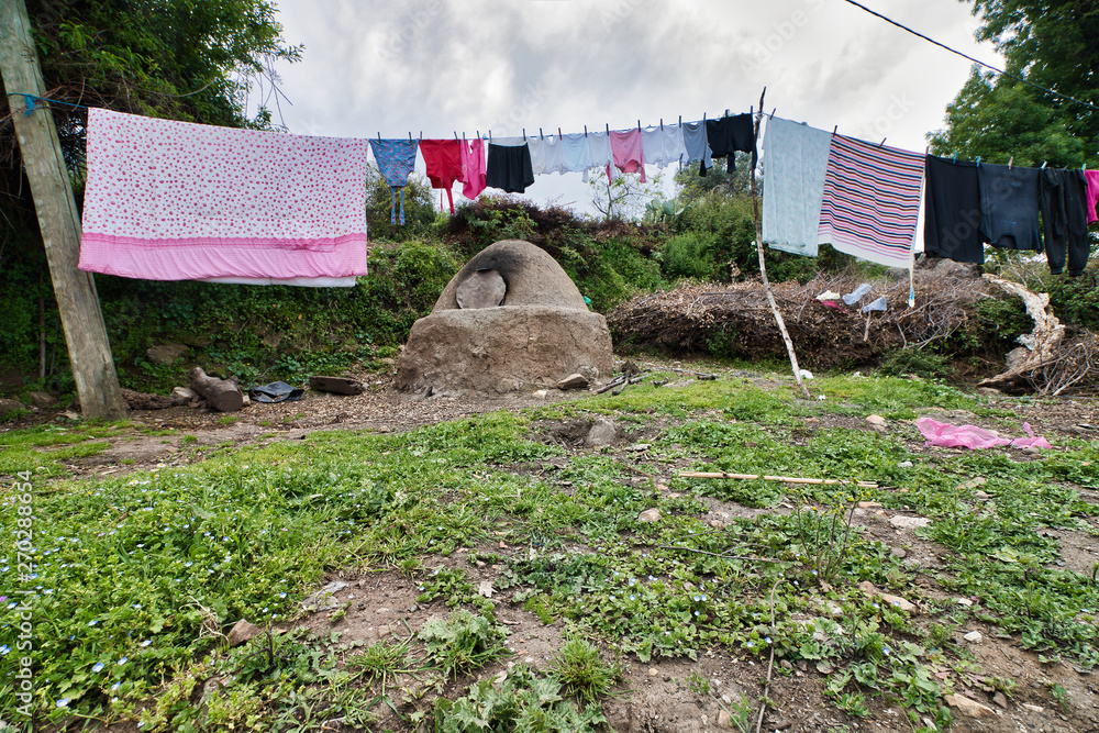 Rural scene with clothes hanging next to a traditional wood-burning oven. Rural area of Khizana, near Chaouen, Morocco
