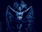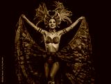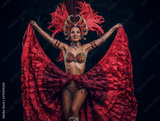 Talented joyful can can dancer in red feather costume is posing at small dark studio.