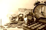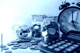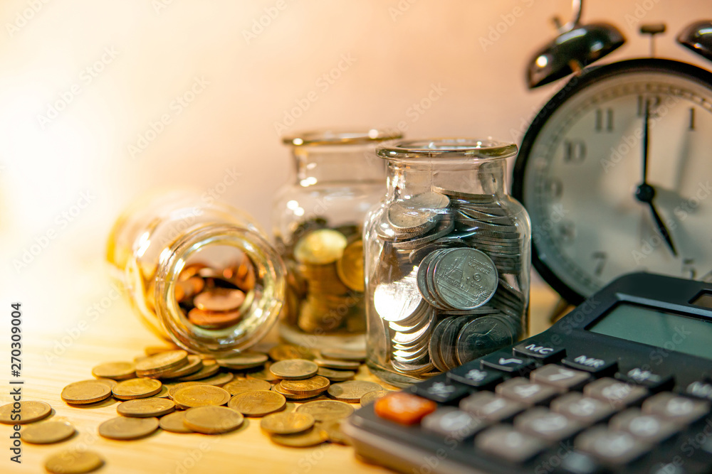 Calculator with coin in currency glass jar and clock on wooden table. Compound interest rate calculation. Financial business plan. Time investment concept