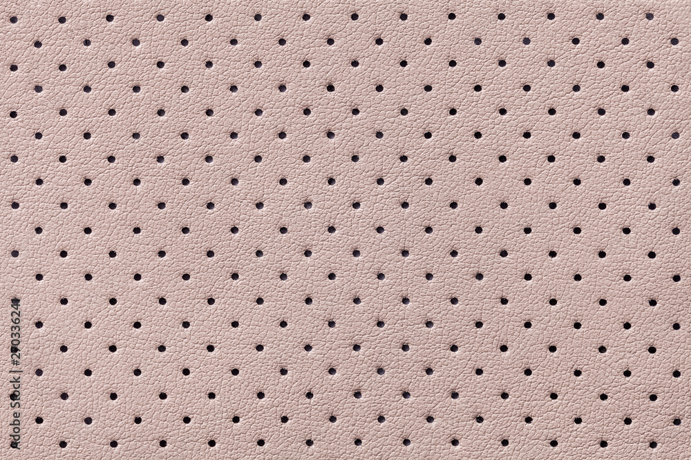 Perforated beige leather texture background, closeup. Light brown backdrop from wrinkle skin.