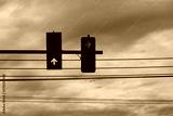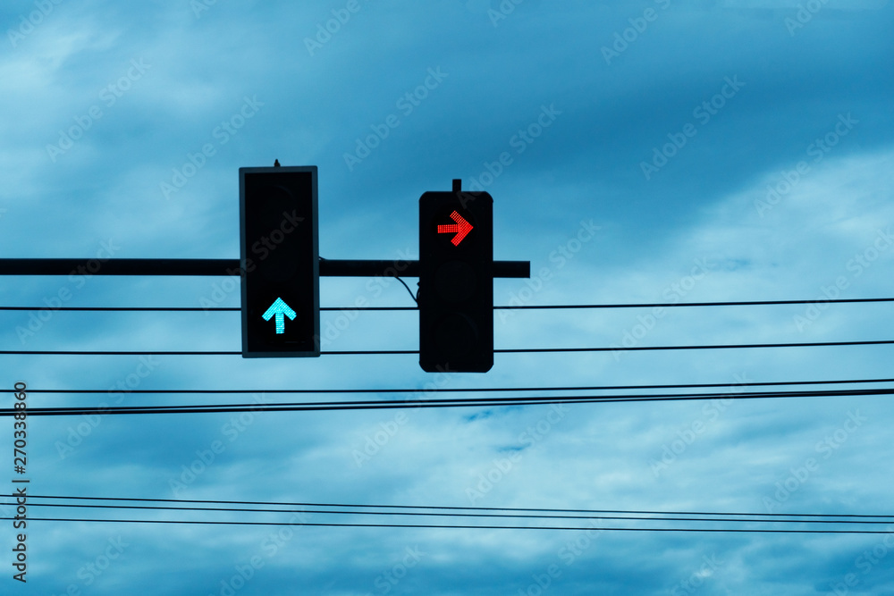 red and green arrow with transport traffic light on black electric wire on blue sky background