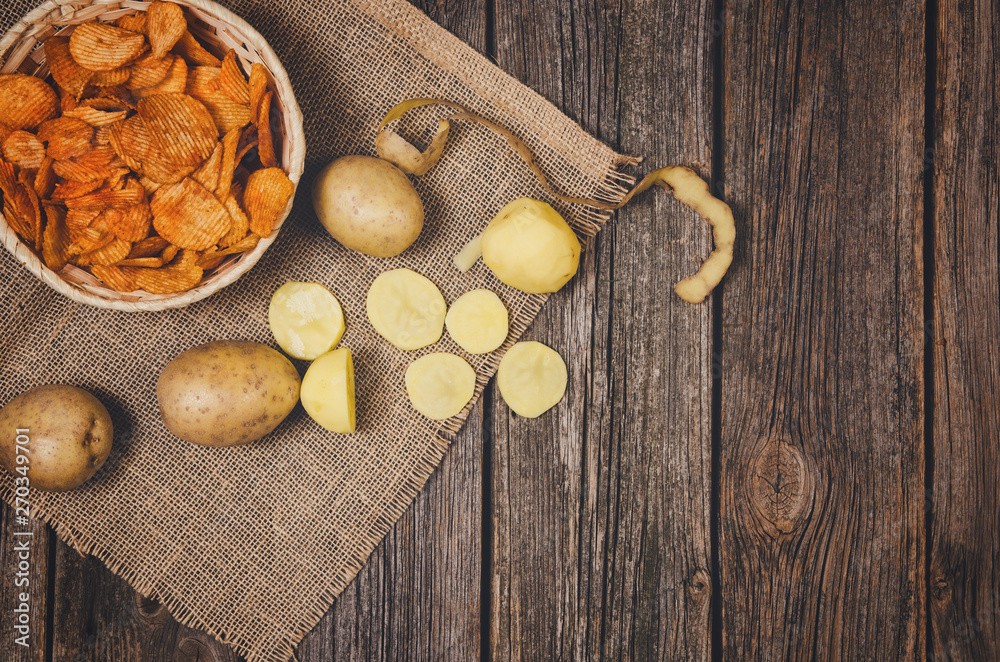 Heap of potato chips in vintage bowl on old wooden table background close-up with copy space for your text