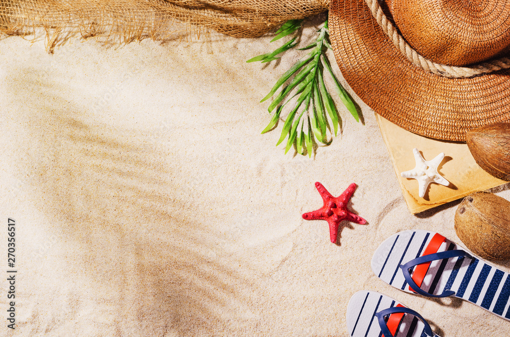 Summer background with copy space. Top view of sandy beach with visible sand texture and exotic accessories. Backdrop for products and mockup.