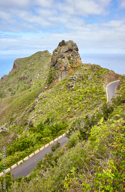 Anaga Rural Park scenic mountain landscape with Atlantic Ocean in distance, Tenerife, Spain.
