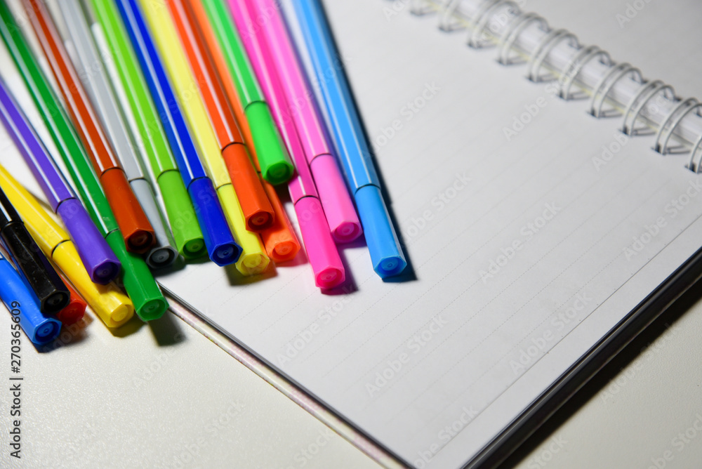 Magic color for drawing for creativity, variety of colors magic pen and book on white background