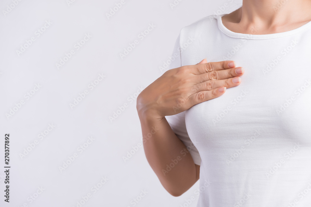 Woman hand checking lumps on her breast for signs of breast cancer on gray background. Healthcare concept.