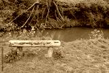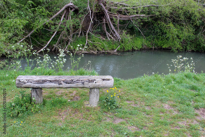 An empty old wooden bench in front of a clean stream. Location is the river Windrush in the Cotswolds countryside, Witney, Oxfordshire, UK.