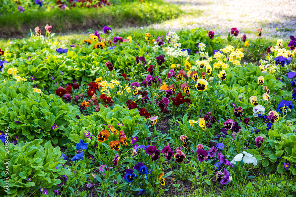 Beautiful Pansies or Violas growing on the flowerbed in garden. Garden decoration