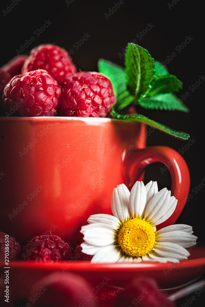 Raspberry in a red cup with chamomile and leaves on a dark background. Summer and healthy food concept. Selective focus.