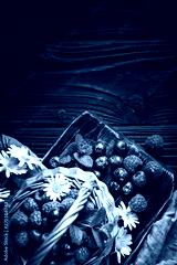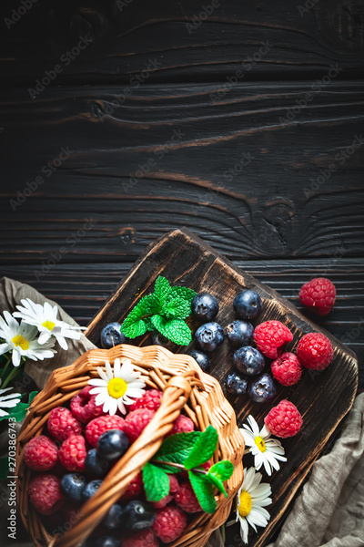 Raspberries and blueberries in a basket with chamomile and leaves on a dark background. Summer and healthy food concept. Selective focus. Background with copy space. Flat lay.