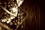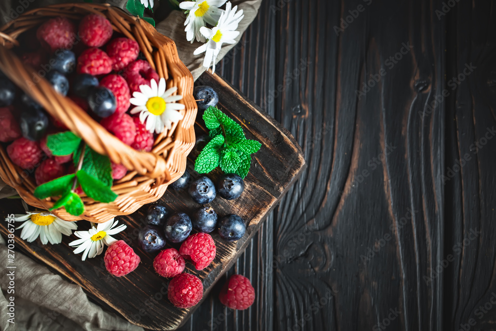 Raspberries and blueberries in a basket with chamomile and leaves on a dark background. Summer and healthy food concept. Background with copy space. Selective focus. Flat lay.