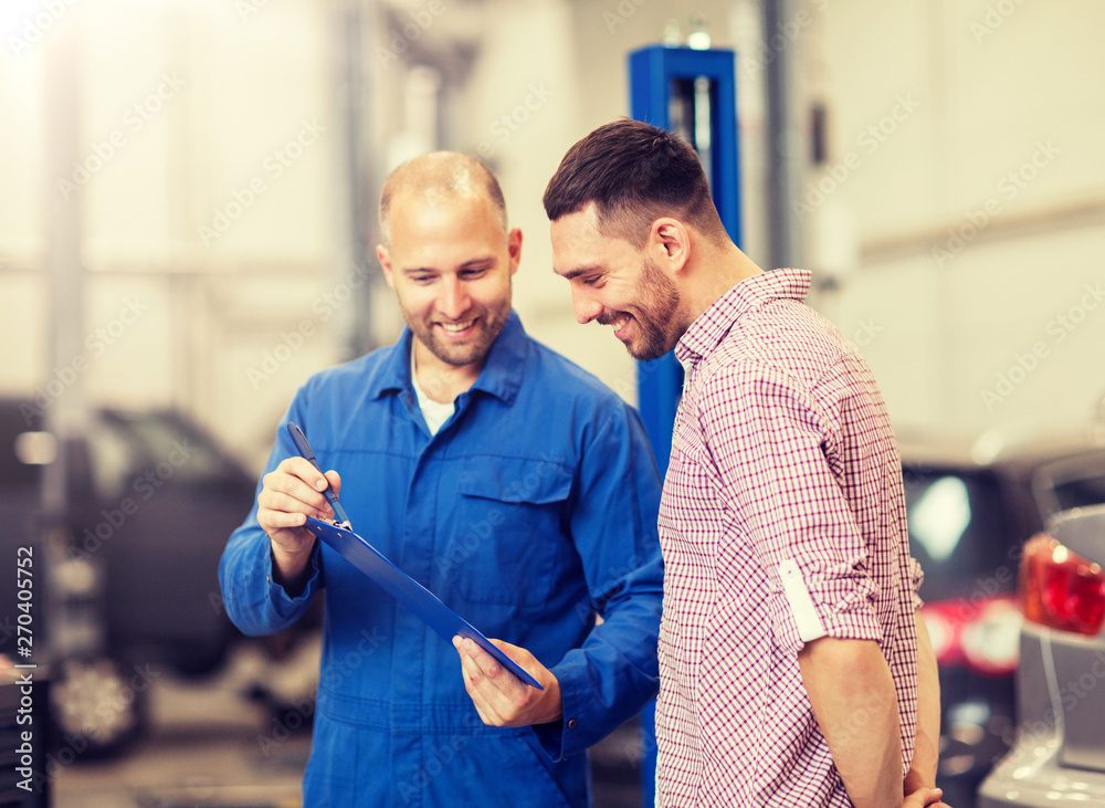 auto service, repair, maintenance and people concept - mechanic with clipboard talking to man or owner at car shop