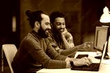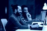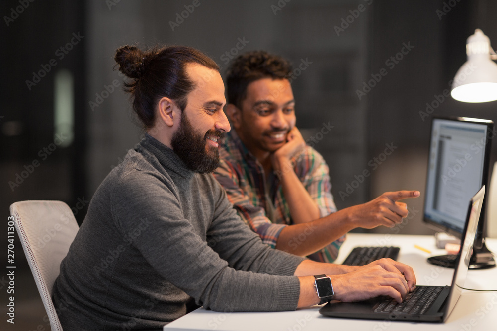 deadline, technology and people concept - creative team with laptop computer working together late at night office