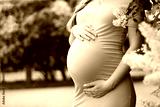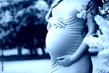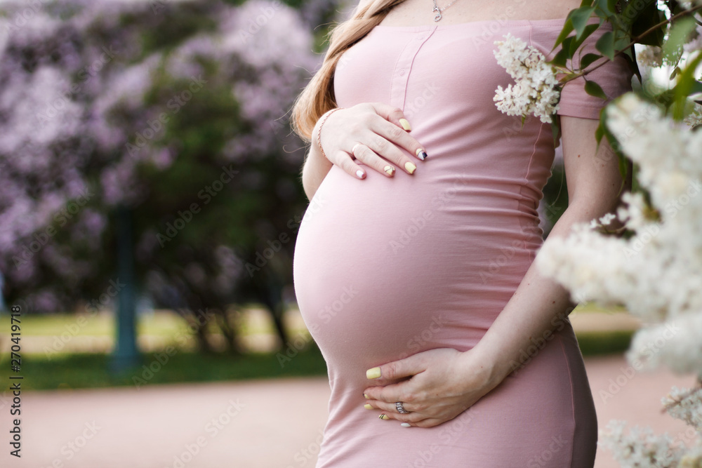 pregnant blonde girl in pink dress with bare shoulders holding hands belly with long hair on the background of lilacs and trees with a big belly on the eighth month of pregnancy close-up