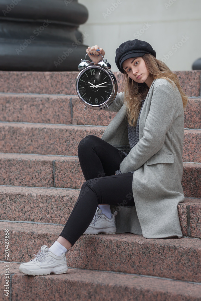 the girl is sitting on the steps and holding a big clock, waiting for a meeting, being late