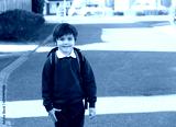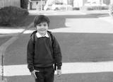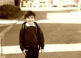 Outdoor portrait of happy child boy with backpack, School kid waiting for school bus, Pupil of primary going to school,Young student beginning of class after school holiday,Back to school concept