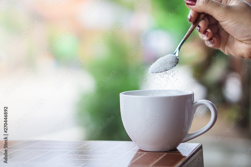 unhealthy woman hand holding spoon pouring sugar in to coffee cup
