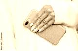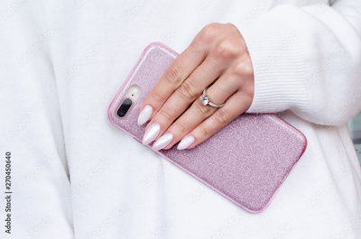 the female hands engagement ring in the sweater is holding a smartphone in glitter case. A beautiful professional manicure with nude wedding design