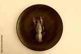 One boiled crayfish on a black plate on the yellow background.Top view.