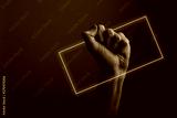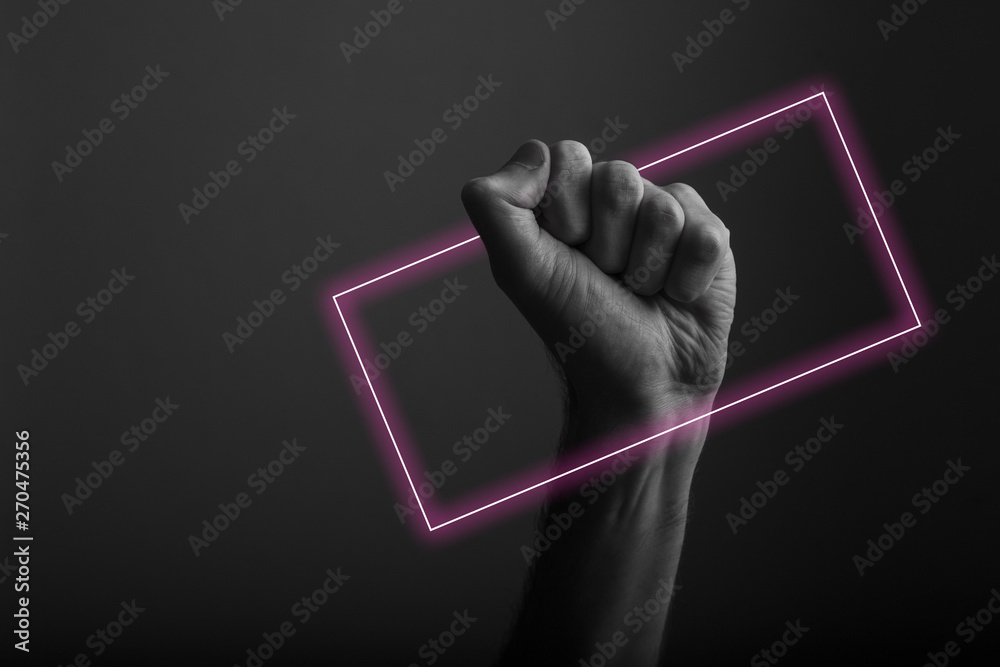 Raised clenched fist against a dark background with abstract neon light glow
