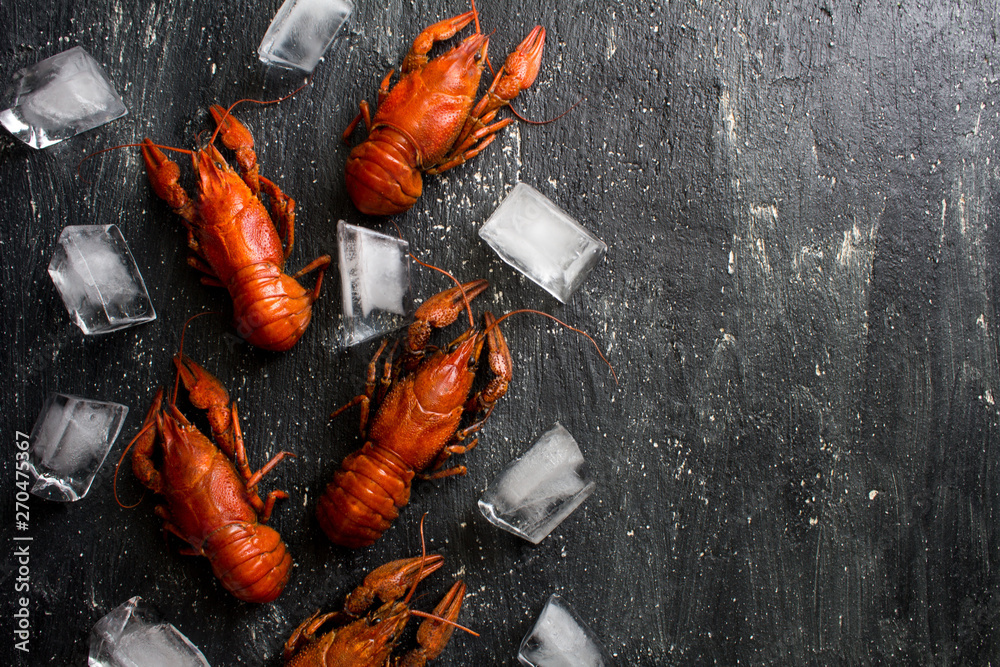 Boiled crayfishes on the dark background.Top view.Copy space.