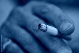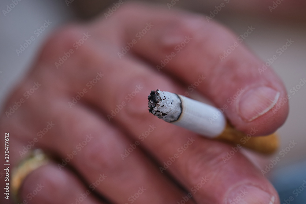macro photo of an old woman hand holding a short smoking cigarette, focus on top of the cigarette, hand is blurred
