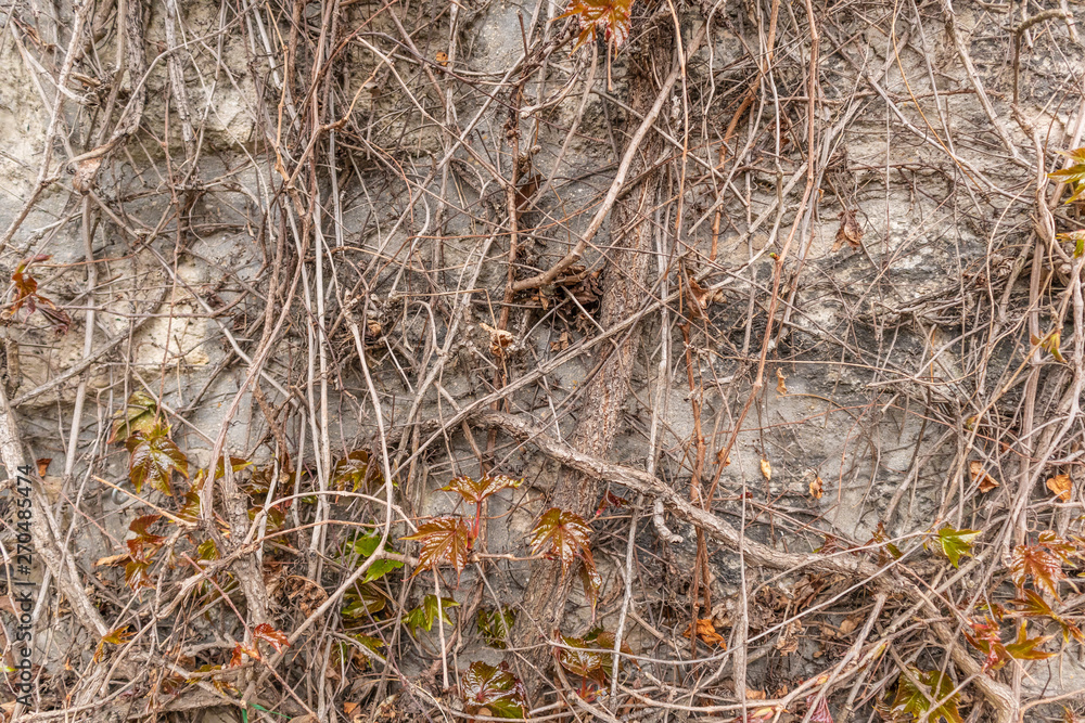Wall covered by dry, leafless branches