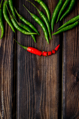 Cooking hot food with chilli pepper on wooden table background top view copy space