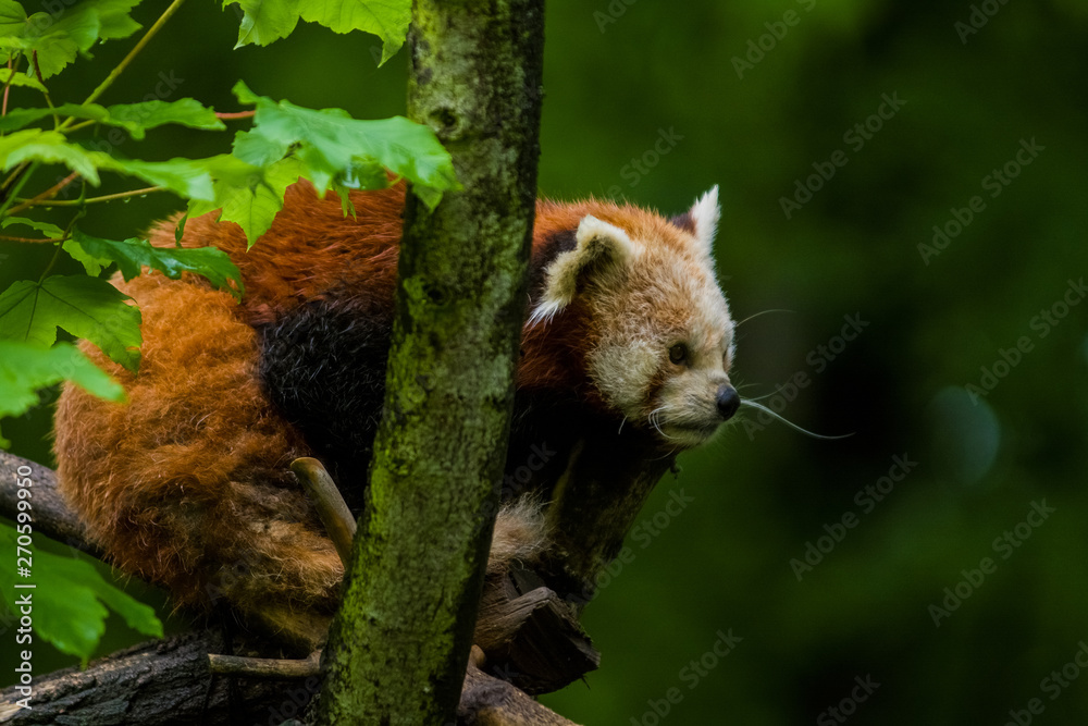 14.05.2019. Berlin, Germany. Zoo Tiagarden. The little red panda sits on branch licks and eats bamboo among greens. Rare and lovely animals.