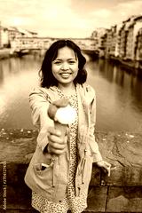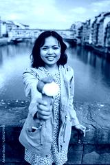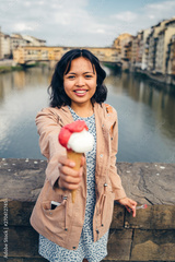 Young Filipino woman shows her ice cream with back Ponte Vecchio. Summer in the city, teenager with the cone on the Arno River. Historic symbol of the city of Florence, the old bridge