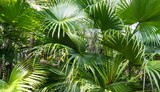 A lot of tropical leaves with long green stripes in the bright sunlight. Nassau, The Bahamas