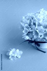White jasmine flowers in the gift box on the blue background.Copy space.