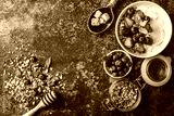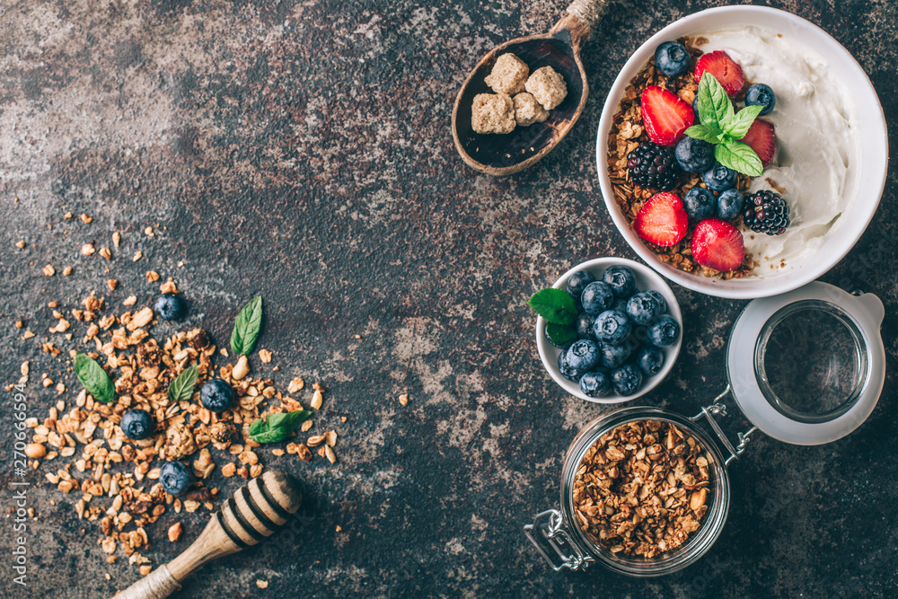 Healthy breakfast with granola, yogurt, fruits, berries on dark metal background. Summer homemade breakfast.