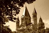 st. martin cathedral, dom of Mainz, Germany on a sunny day, photographed through green trees