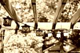 Closeup of patio outdoor spring garden in backyard of home with lantern lamps lights hanging from pergola canopy wooden gazebo and plants
