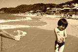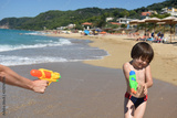 Little boy and his mother play with a water gun on beach. Cheerful family playing at beach