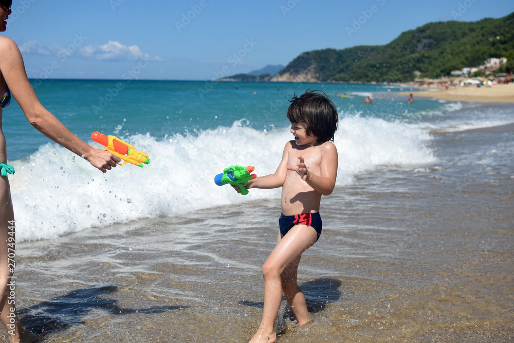 Little boy and his mother play with a water gun on beach. Cheerful family playing at beach