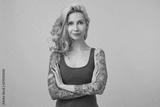 Portrait of positive cute lady with pink hair and tattooed hands, standing over pink background and smiling, wearing a blue shirt. People and emotion concept.