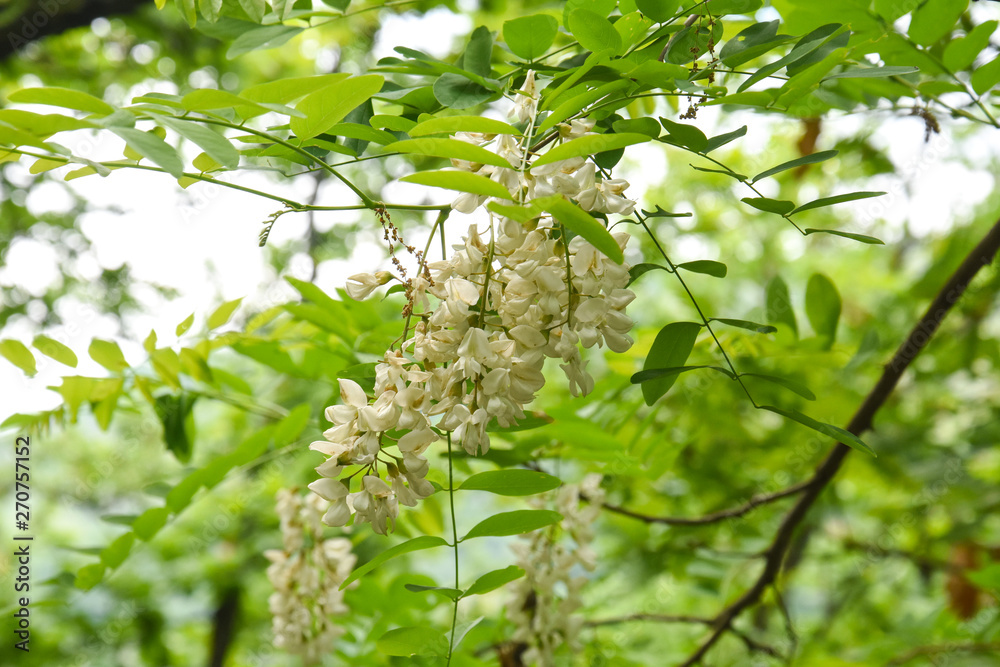Acacia flower. Branch of white acacia blooming in spring