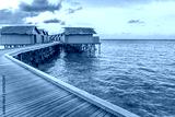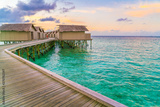Beautiful water villas in tropical Maldives island at the sunset time .