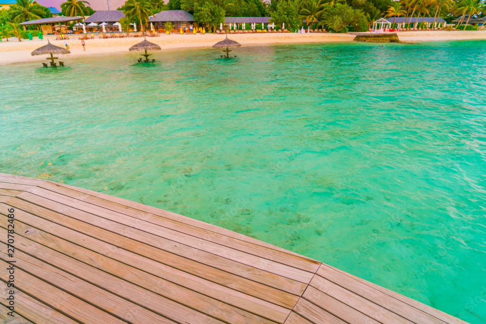 Vacation net seat in tropical Maldives island and beauty of the sea with the coral reefs .