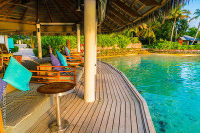 Vacation seat in tropical Maldives island and beauty of the sea with the coral reefs .