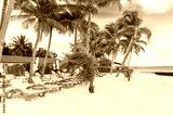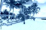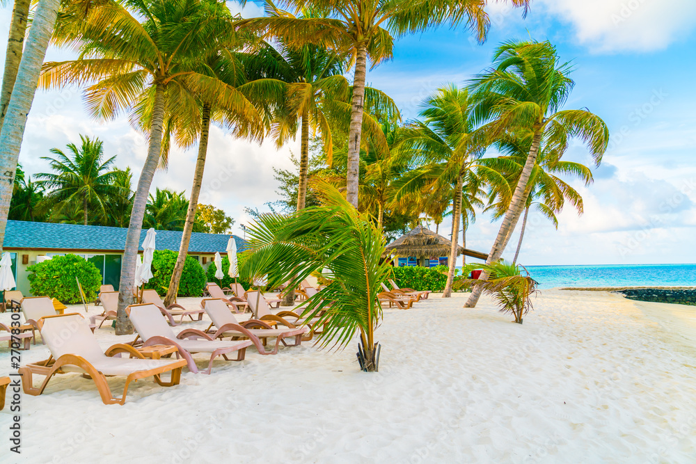 Beach chairs with umbrella at Maldives island, white sandy beach and sea .