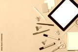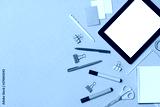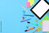 School office on a colored background top view. Office office, student office. Concept back to school. place for text. Flatlay