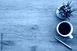 Wood office desk table with cup of coffee, pen and cactus pot. Top view with copy space, flat, lay.